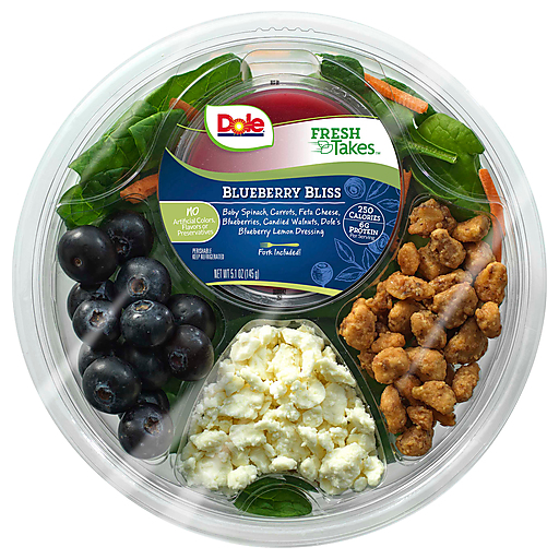 Baby Spinach, Blueberry Lemon Dressing (Soybean Oil And/Or Canola Oil, Water, Sugar, White Balsamic Vinegar [White Wine Vinegar, Concentrated Grape Must], Lemon Juice Concentrate, Blueberry Juice Concentrate, Natural Flavors, Salt, Garlic, Xanthan Gum, Spices), Carrots, Feta Cheese (Pasteurized Milk, Salt, Cheese Cultures and Enzymes), Blueberries, Candied Walnuts (Walnuts, Cane Sugar, Sea Salt).