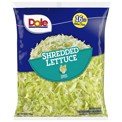 Iceberg Lettuce. Thoroughly washed. The simple flavor of iceberg can enhance almost any dish. This convenient topper is a must-have for tacos - try it on burgers, sandwiches, and wraps too. Preservative free. Satisfaction guaranteed. Dole.com. Facebook. Twitter. Pinterest. Instagram. Connect! (hashtag)Dole. Questions? Comments? Visit Dole.com or call us at 1-800-356-3111.
