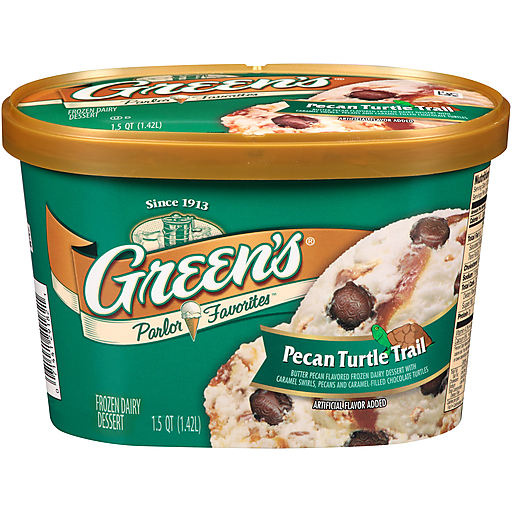 Butter pecan flavored frozen dairy dessert with caramel swirls, pecans and caramel-filled chocolate turtles. Artificial flavor added. Back in 1913, my grandfather, Clarence Green, began delivering fresh dairy products door to door with a horse and wagon. He always made sure that his customers received only the finest, highest quality milk and ice cream products. Our family is still making ice cream, and our commitment to high quality holds as true today for Green's Ice Cream as it did for my grandfather over 90 years ago. - James B Green. Manufactured at plant code stamped on carton. Real. www.GreensIceCream.com.