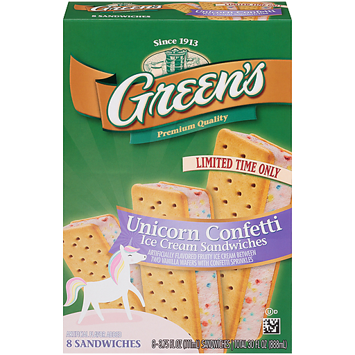 Limited Time Only Artificially flavored fruity ice cream between two vanilla wafers with confetti sprinkles. Artificial flavor added. Produced with genetic engineering. Since 1913. Premium quality. GreeniceCream.com.