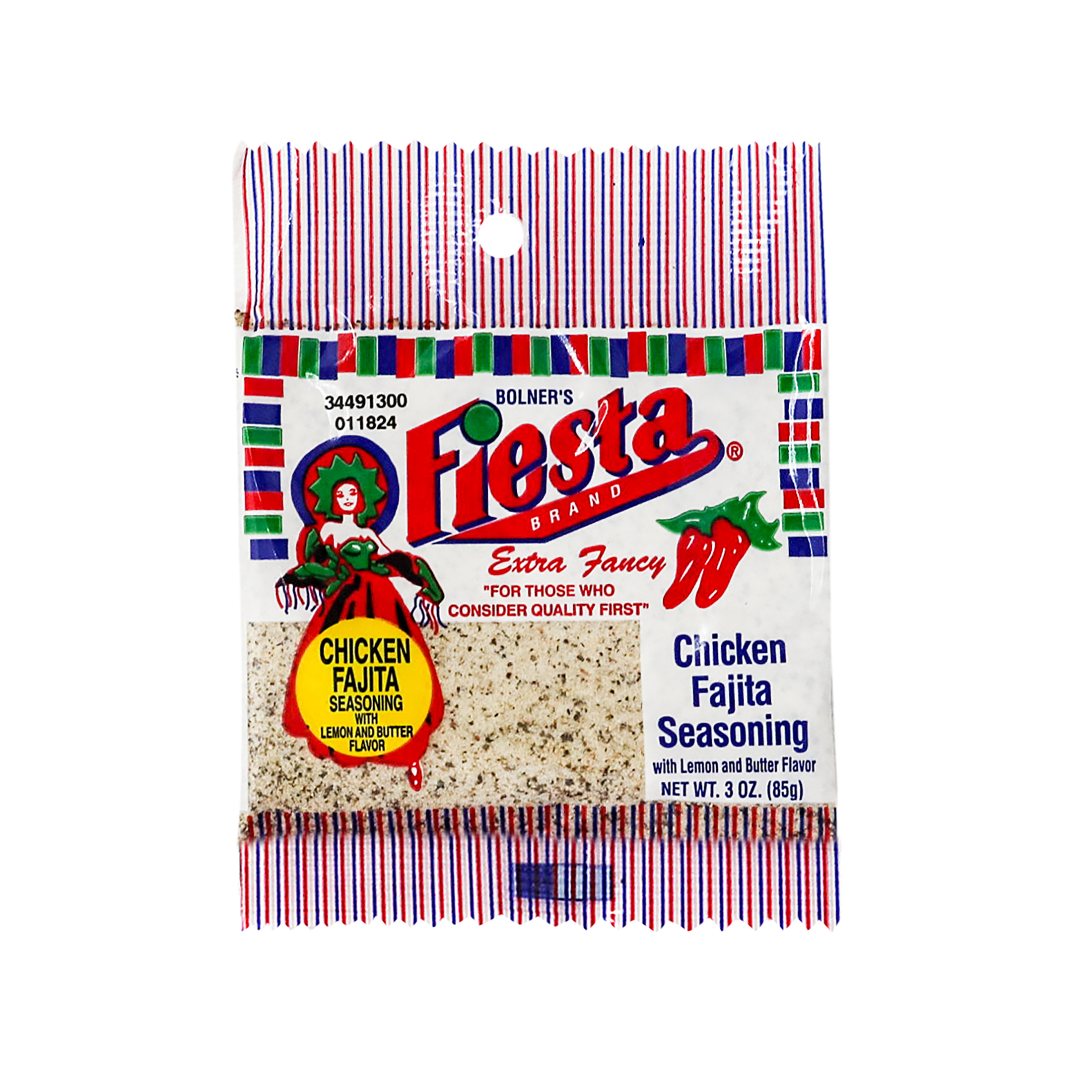 A delicious blend of garlic, onion and butter flavors with hints of lemon and a tenderizing agent, Bolner’s Fiesta Brand Chicken Fajita Seasoning (3 ounce) is your ticket to authentic chicken fajitas. Simply sprinkle boneless chicken breasts with Chicken Fajita Seasoning and let stand for 30 minutes before searing over an open flame. Slice the chicken into thin strips and serve hot on warmed tortillas with fresh salsa, lettuce and shredded cheese.