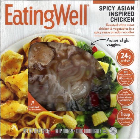 We're so proud of this beautiful entree-we want you to see it right in the box!? Vacuum sealing locks out oxygen to maintain freshness? Fresh-Seal? film material is food safe and easy to remove after cooking? Individually hand-plated.EatingWell® magazine started out on a country road in vermont. Our aim was to help you make sense of nutrition and cook delicious food made from simple, nourishing ingredients. Today our goal is the same, but we're doing the cooking for you!You will love our Spicy Asian Inspired ChickenWe combined traditional Japanese udon noodles with Chinese kung pao style sauce-and loads of vegetables, of course!-to give this dish a fusion flavor that's both surprising and familiar.Fresh-Seal? for freshness!Our cool Fresh-Seal? technology vacuums in the fresh flavors of this meal.