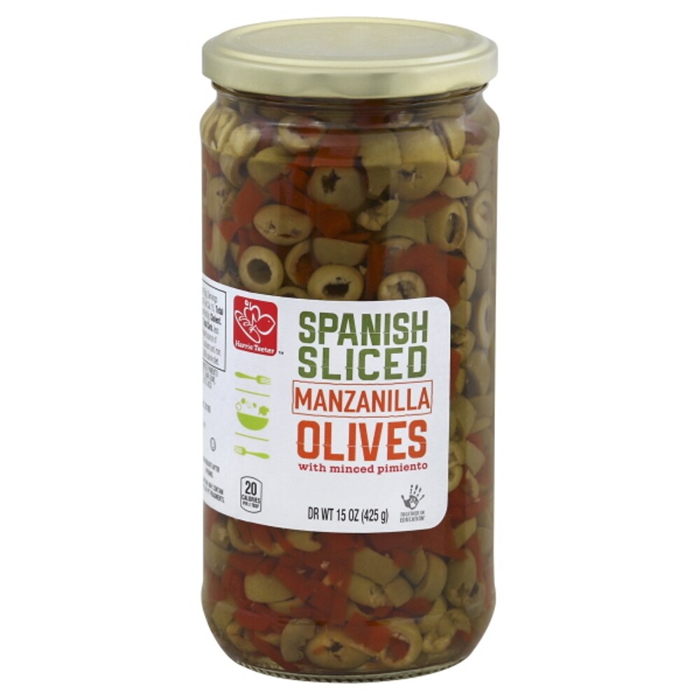 Spanish Sliced Manzanilla Olives With Minced Pimiento is manufactured by Harris-teeter Inc. with a suggested serving size of 2 Tbsp (15 G) and has 20 calories per serving.