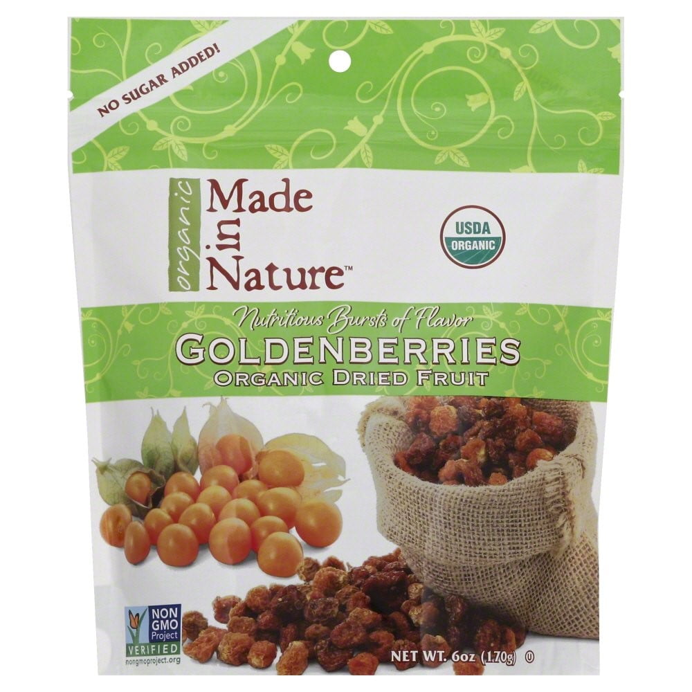 Nutritious Bursts of FlavorNon-GMO VerifiedUSDA OrganicNo Sugar AddedKosherUnsulfered!Great Tasting Organic?Real Food. Real Flavor. Really Good.Made In Nature's Organic Goldenberries are tender, chewy berries with the perfect balance of sweet and tart flavors - your tastebuds will dance and sing with each sparkling bite. They're perfect right out of the bag and can also brighten some of your favorite recipes from smoothies to salads. And best of all, the Organic Goldenberies are rich in fiber and a good source of Vitamin C. Permission to snack away granted.How is it done? Made in Nature? works with the most dedicated family of farmers to grow the best tasting, organic whole fruit on the planet. Their Organic Goldenberries are grown on small, family farms in the Andes Mountains where the bountiful rain produces mouthwatering berries. Each berry ripens on the vine and is succulently sun-dried to retain just the right amount of moisture.When you purchase Made in Nature products, their Great Tasting Organic seal guarantees that you will never again have to compromise on flavor to get the healthy nutrition you crave. Free Of GMOs. Disclaimer These statements have not been evaluated by the FDA. These products are not intended to diagnose, treat, cure, or prevent any disease.