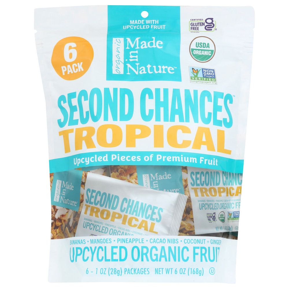 MIN Second Chances Organic Tropical flavor is a delicious healthy dried fruit snack, which also reduces food waste, helps the environment and is a top solution to climate change. Upcycling also provides an incremental revenue stream to farmers which aids in employment. Made In Nature's credo is "doing well by doing good".