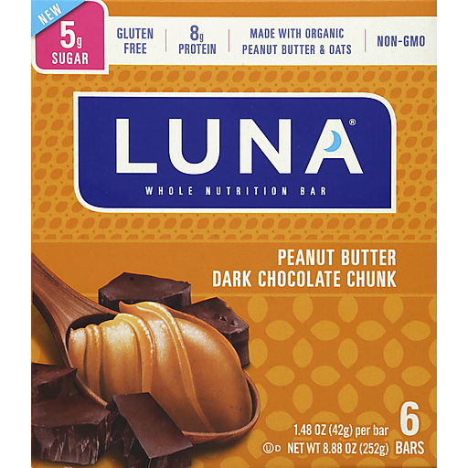 New. 5 g sugar. Gluten free. 8 g protein. Made with organic peanut butter & oats. Non-GMO. We all crave a snack that does more than merely get us through the day. It needs to nourish, curb hunger, and taste great - to satisfy entirely. Say hello to Luna, the indulgently delicious snack that multitasks! Luna contains 8 g of protein, 3 g of fiber (Contains 9 g total fat), vitamins and minerals to support women's health, and quality organic ingredients such as dark chocolate, gluten-free oats, and nuts. With all this, it's never been easier to fall in love with Luna.