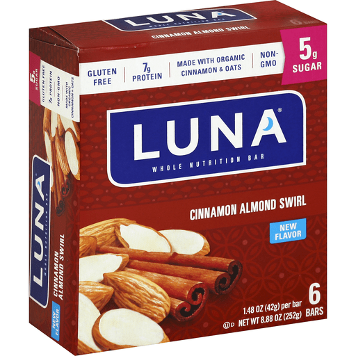New flavor. Gluten free. 7 g protein. Made with organic cinnamon & oats. Non-GMO. 5 g sugar. In 1999, we created Luna, the first nutrition bar for women.
