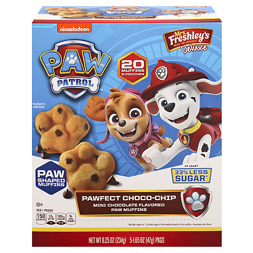 Pawfect Choco-Chip Mini Chocolate Flavored Paw Muffins When hunger strikes, Paw Patrol is on a roll! Enjoy the mouthwatering flavor of our Pawfect Choco-Chip Flavored Mini Muffins in a fun paw shape. With even more flavors like Barkin' Blueberry Flavored Mini Paw Muffins, you can give kids all the taste they love, with at least 33% less sugar* that parents love.