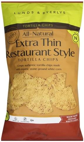 All natural. Crispy authentic tortilla chips made with organic stone ground white corn. 0 g trans fat. Gluten free. Made with organic white corn. Since 1939. Tradition, service, quality. Lunds & Byerlys All-Natural Extra Thin Restaurant Style Tortilla Chips are made with organic stone ground white corn. LundsandByerlys.com. Oregon Tilth as organic certifier.