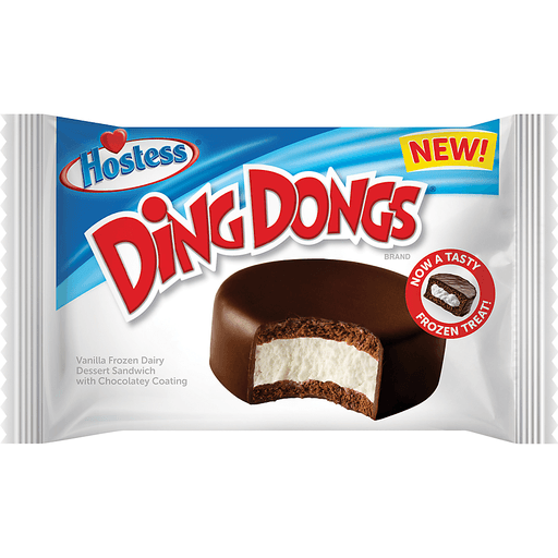 Introducing HOSTESS DING DONGS - the classic snack you love, now a tasty frozen treat! In 1967, the world was introduced to the Hostess Ding Dongs with a ringing bell. Now, we have increased the chill factor on our king of cakes and created you a new way to lose yourself in all that out-of-control chocolatey goodness: vanilla filled frozen sandwich, fully dipped in a chocolatey coating. Delectably Ding Dongs! Introducing HOSTESS DING DONGS - a tasty frozen treat! Vanilla frozen dairy dessert sandwich with chocolatey coating.