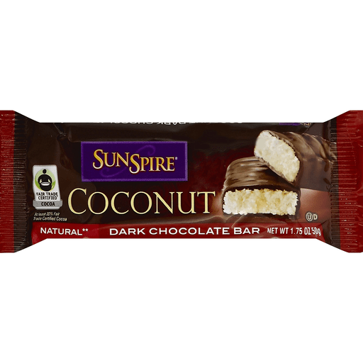 Sunspire Dark Chocolate Coconut Bar Has A Minimum 20% Fair Trade Cocoa Content, So The Environment Is Protected In The Making Of This Bar. A Shell Of Rich Dark Chocolate Is Filled With Coconut And Rice Syrup For A Decadent Treat That Is Suitable For Dessert Or A Snack Between Meals. This 1.74 Oz. Bar Has 0 G. Trans Fat And Contains No Hydrogenated Oils.