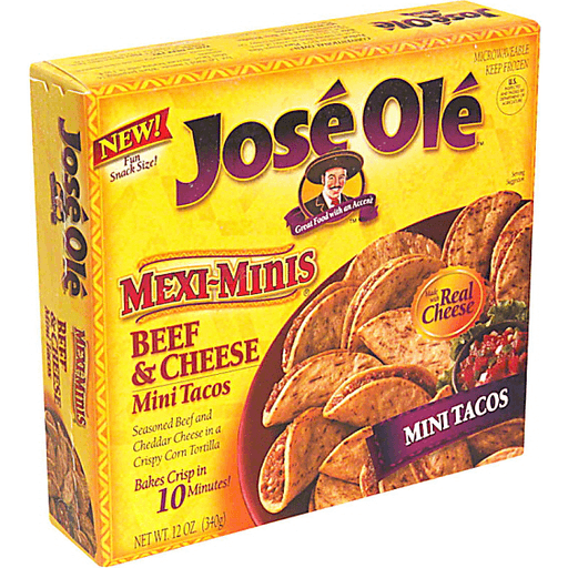 Seasoned Beef and Cheddar Cheese in a Crispy Corn Tortilla. Bakes crisp in 10 minutes! Fun snack size! Microwaveable. Made with real cheese. Jose Ole Mexi Minis are everything you love about Mexican style food - in a new, fun-to-eat size. Our Beef and Cheese Mini Tacos are made with seasoned beef, real cheddar cheese and fresh, oven-baked corn tortillas, for a crispy texture and big taste your whole family will enjoy. With Jose Ole, you always get homemade taste and quality.