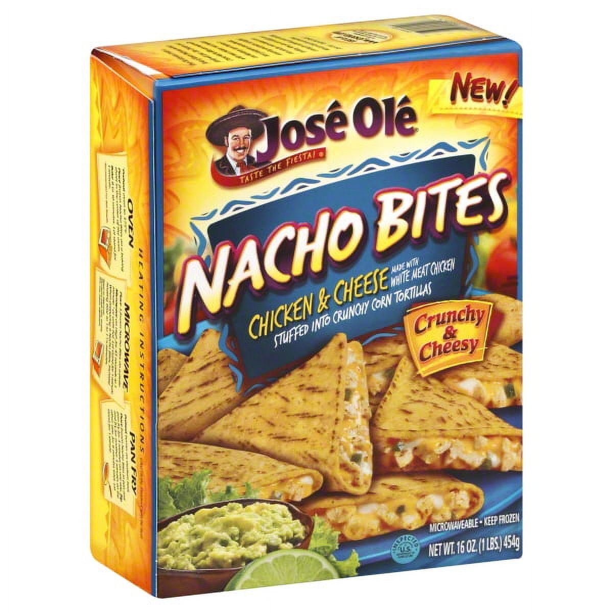 Jose Ole® Nacho Bites Chicken & Cheese. Taste The Fiesta®! 8g protein per serving. In crunchy corn tortillas. Made with white meat chicken & real cheese. Inspected for wholesomeness by U.S. Department of Agriculture. Prefried in vegetable oil. Please have this package available. For more information call us at 1-877-653-2181 toll free. Visit us at www.joseole.com.