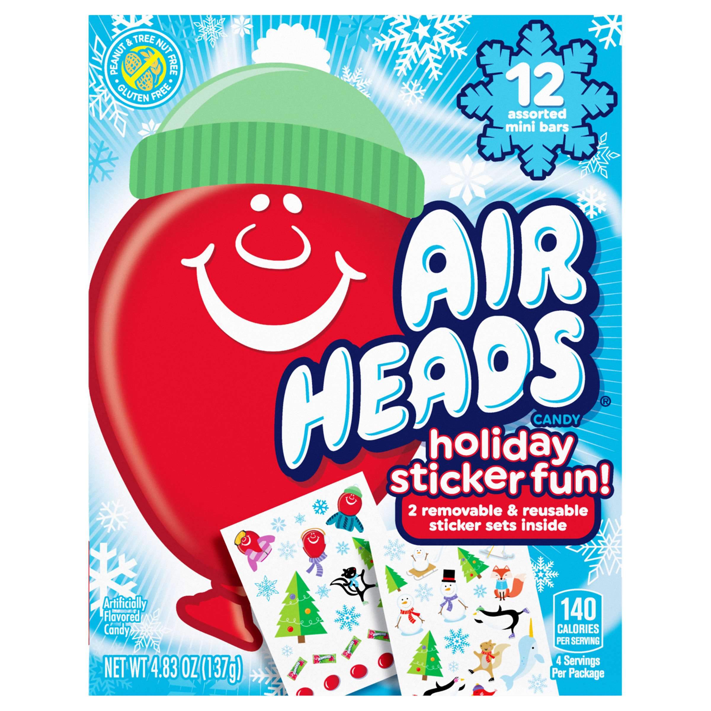 Seasonal themed book with 12 assorted Airheads mini bars. With flavors that include cherry, watermelon and blue raspberry. These Airhead mini bars are bursting with flavor. This seasonal themed book includes winter themed removable stickers, which are great for children. These bars are nut and gluten free. Great to share or keep for a great snack!