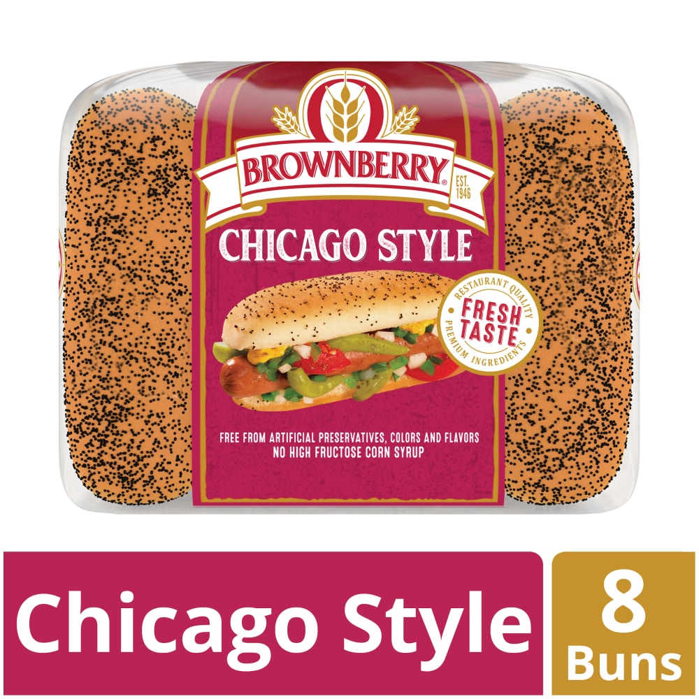 Brownberry Chicago-Style Hot Dog Buns are carefully crafted, baked to perfection and topped with poppy seeds. No high fructose corn syrupA cholesterol free food0 g trans fat8 buns per package.