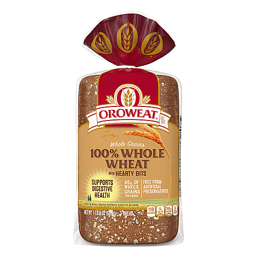 - The manufacturer of 100% Whole Wheat Whole Grains Bread with Hearty Bits, 100% Whole Wheat is Oroweat.