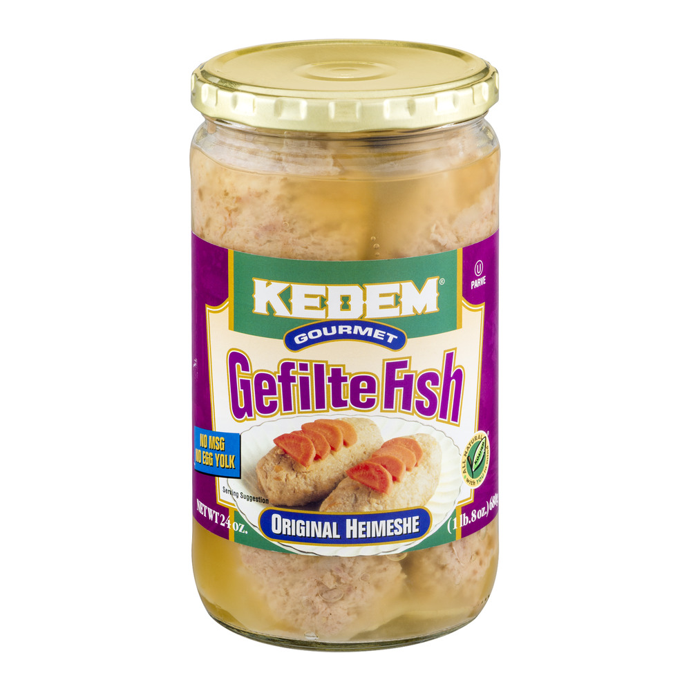 Gefilte Fish (24oz.). Enjoy Kedem traditional gefilte fish (Kosher cuisines quintessential appetizer) at any time of day. Just like grandmas. Just like grandmas. Jarred gefilte fish. All Natural. Certified by the OU. Certified by the Tzehlemer Rav.