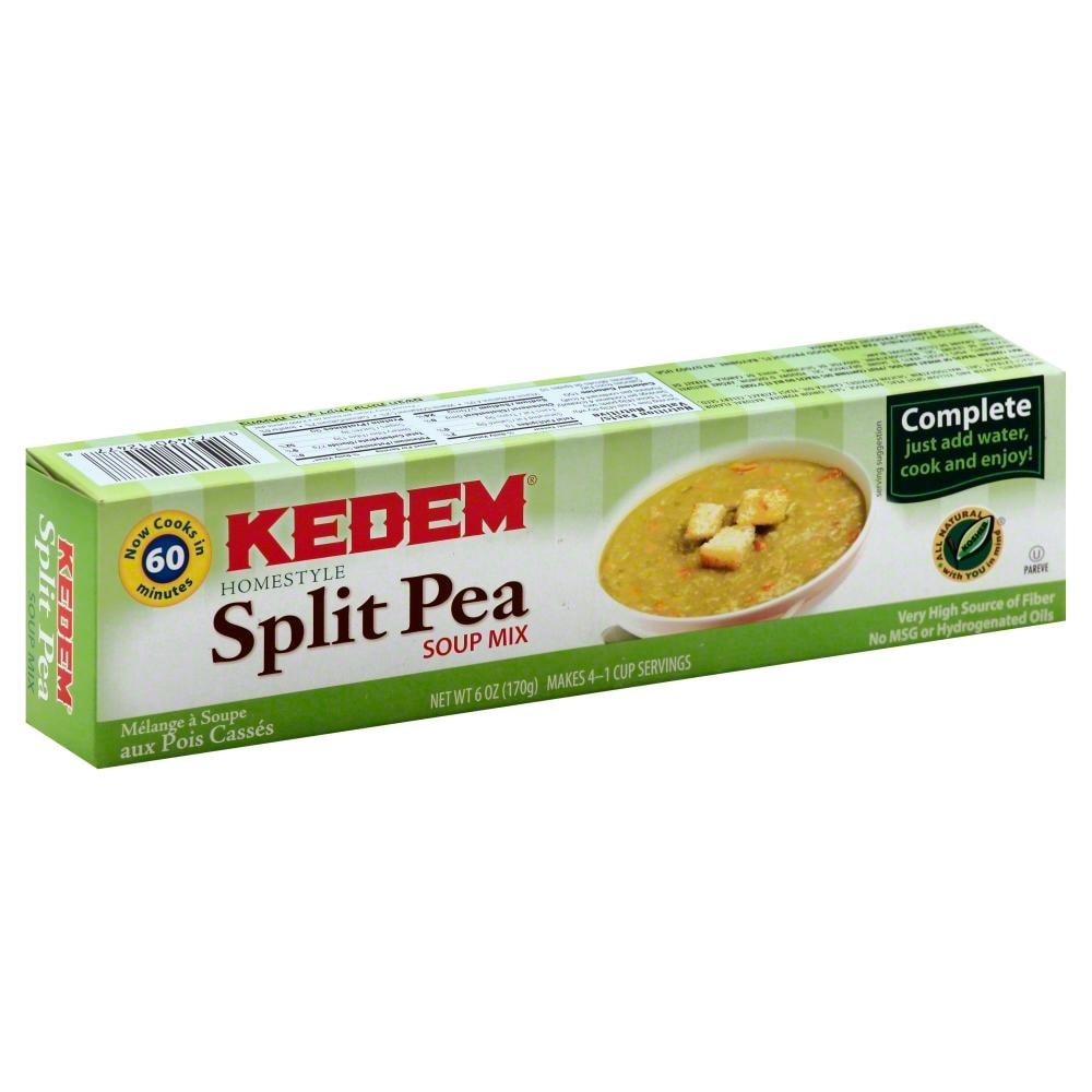 Kedem® Homestyle Split Pea Soup Mix. Now cooks in 60 minutes. Complete just add water, cook and enjoy! All natural kosher with you in mind. Makes 4-1 cup servings. Very high source of fiber. No MSG or hydrogenated oils.