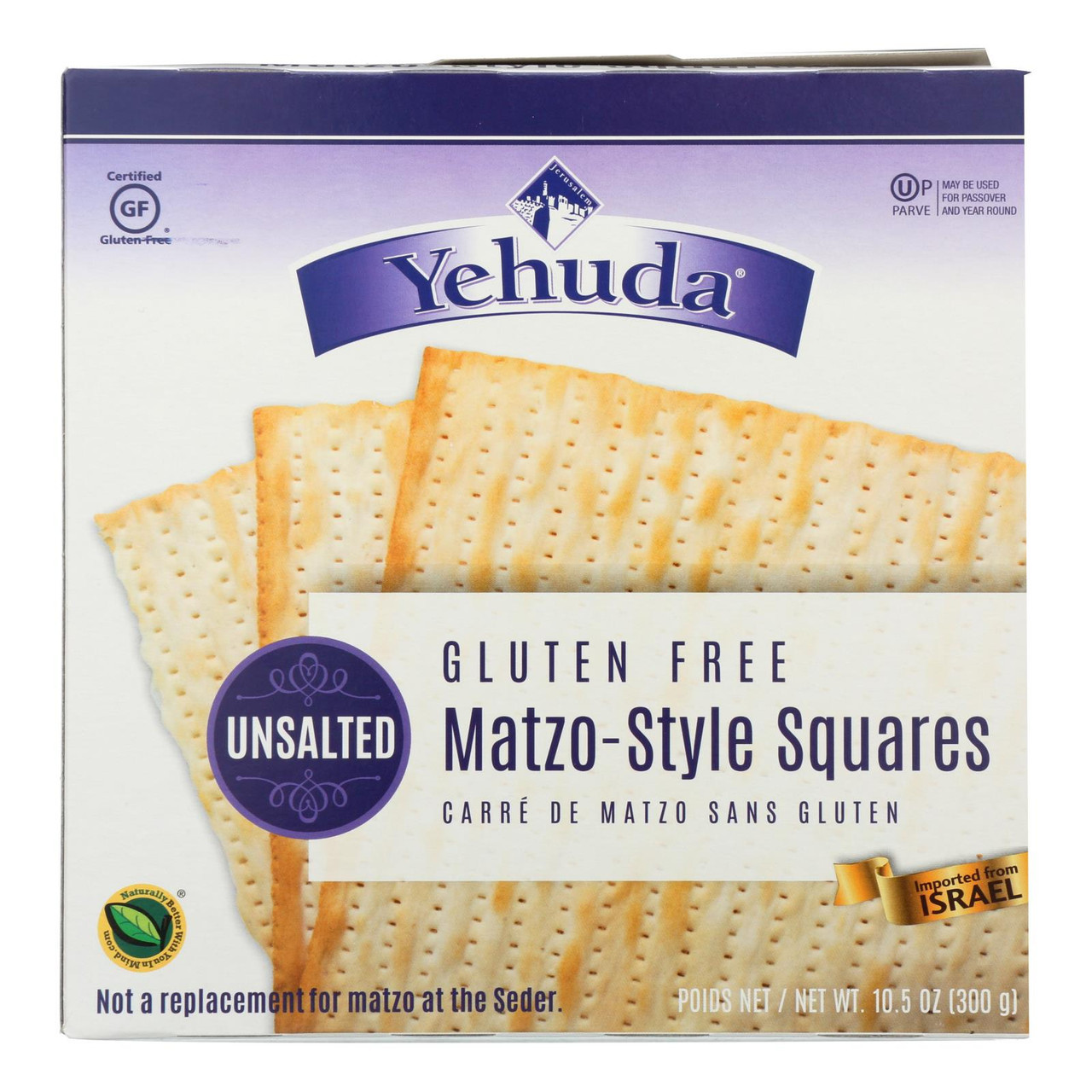 Gluten Free, unsalted Matzo-style squares. Imported from Israel and Kosher for Passover and year round.