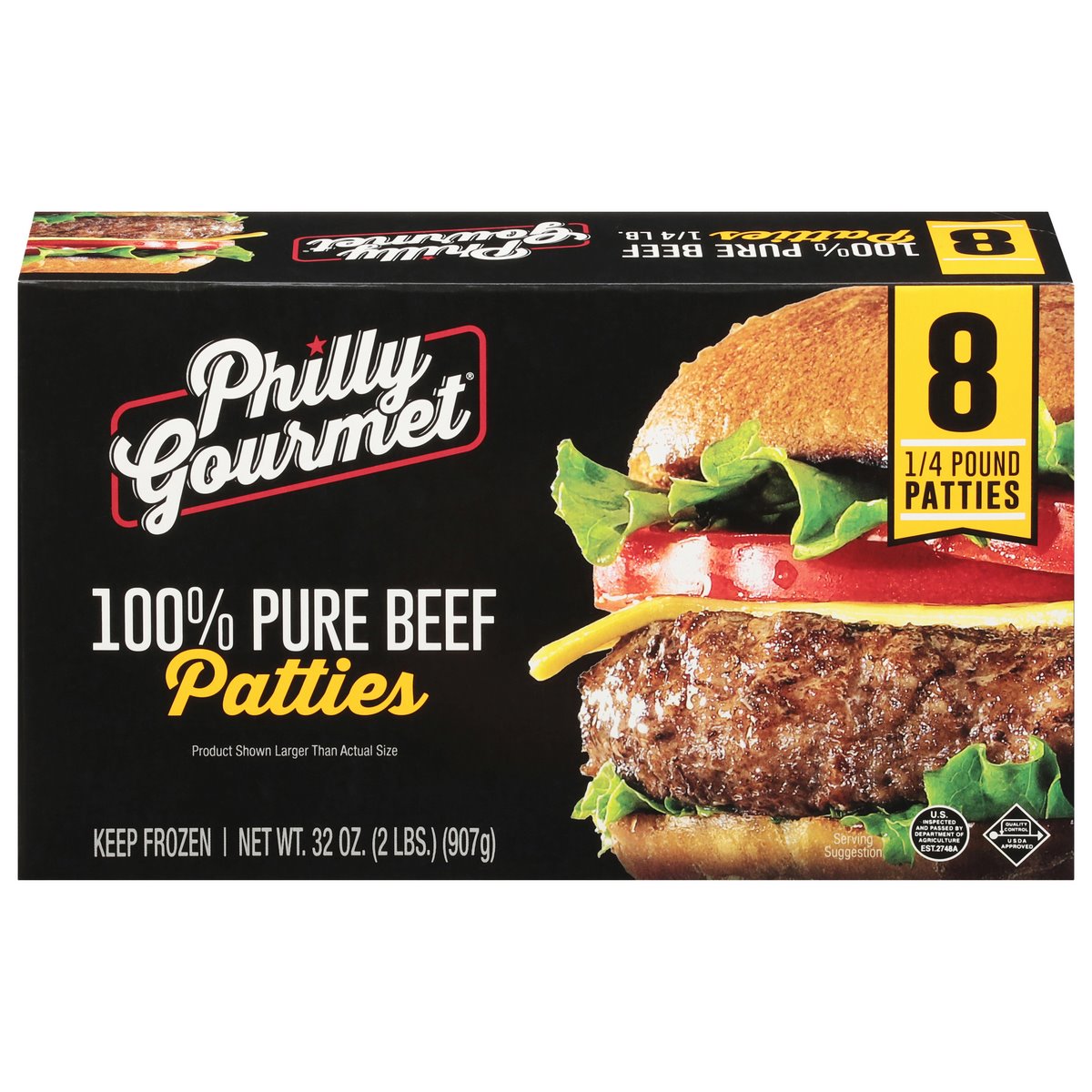- The manufacturer of 100% Pure Beef Patties is Philly Gourmet.
