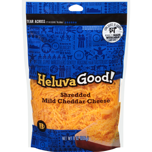 Heluva Good!® Country Gourmet Shredded Mild Cheddar Cheese. 2 cups. Country gourmet shreds from Heluva Good!® are a convenient way to serve up full-bodied flavor for any occasion. Wholesome and delicious, these finely -cut shreds are great for casseroles and quiches, and are the perfect touch for many of your favorite recipes. Heluva Good!® country gourmet shreds are easy to mix and fast to melt. Our convenient 2-cup size means you're sure to have enough for all your recipes! Like all Heluva Good!® products, our country' gourmet shreds are tailored for today's busy lifestyles. Try our other country gourmet shred varieties. There's a flavor for every taste and for every recipe, so try them all! If you have any questions or concerns about this product please call 1-800-644-5473. For more information visit www.heluvagood.com. ® HP Hood LLC.