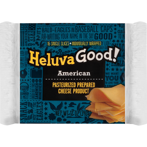 Heluva Good!® Yellow American Pasteurized Process Cheese Product. 16 single slices. Individually wrapped. If you have any questions or concerns about this product please call 1-800-644-5473. For more information visit www.heluvagood.com. ®HP Hood LLC.