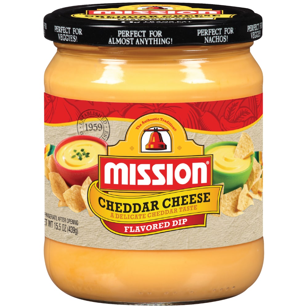 Mission® Cheddar Cheese Flavored Dip. Perfect for veggies! Perfect for almost anything! Perfect for nachos! Established 1959. The Authentic Tradition. 0g trans fat per serving. A delicate cheddar taste. Gruma. Taste nutrition quality.