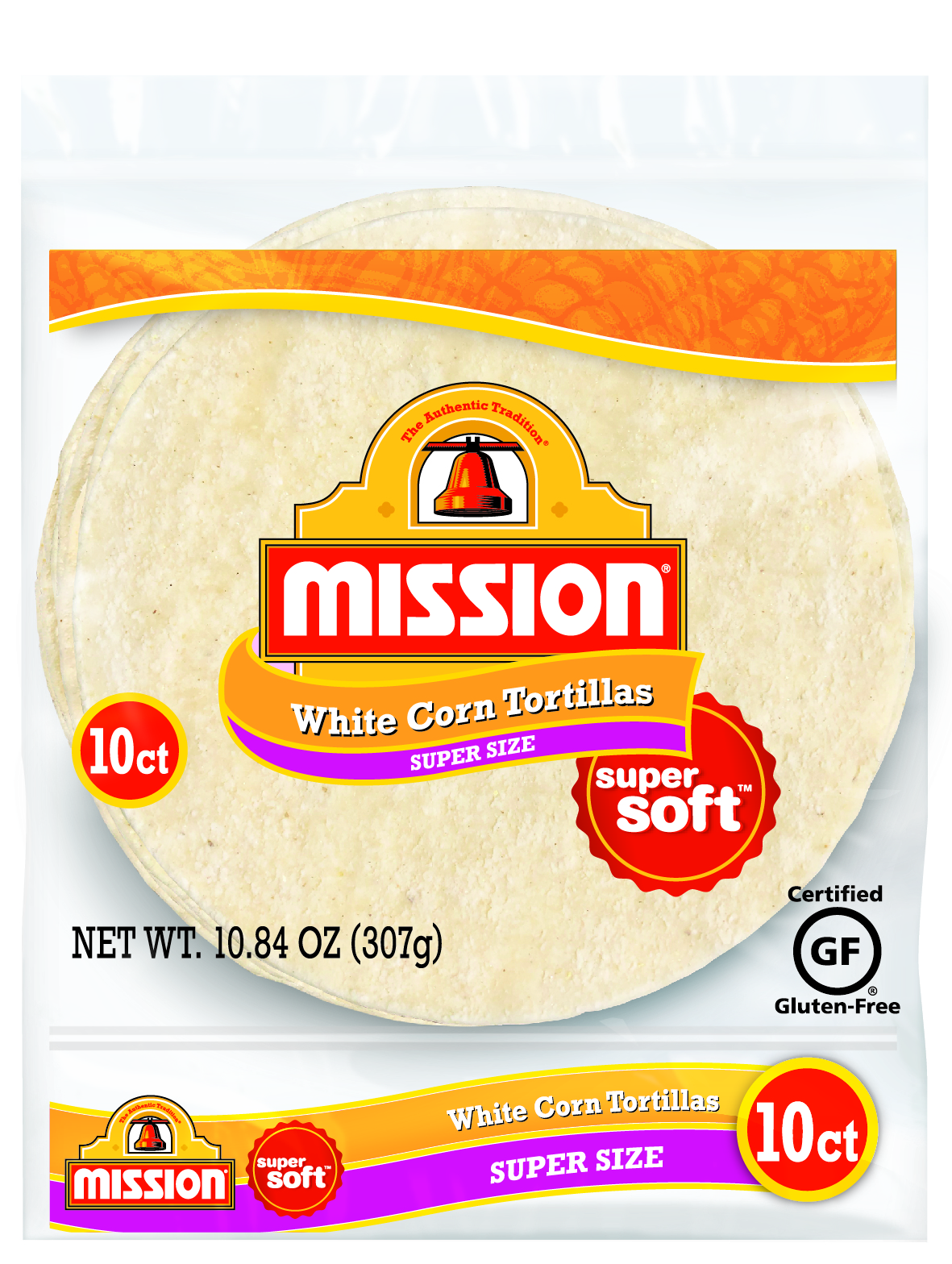 One 10 count package of Mission Super Size White Corn Tortillas. Super soft texture. Certified gluten free. No trans fat, lard, or cholesterol. Versatile addition to any recipe.