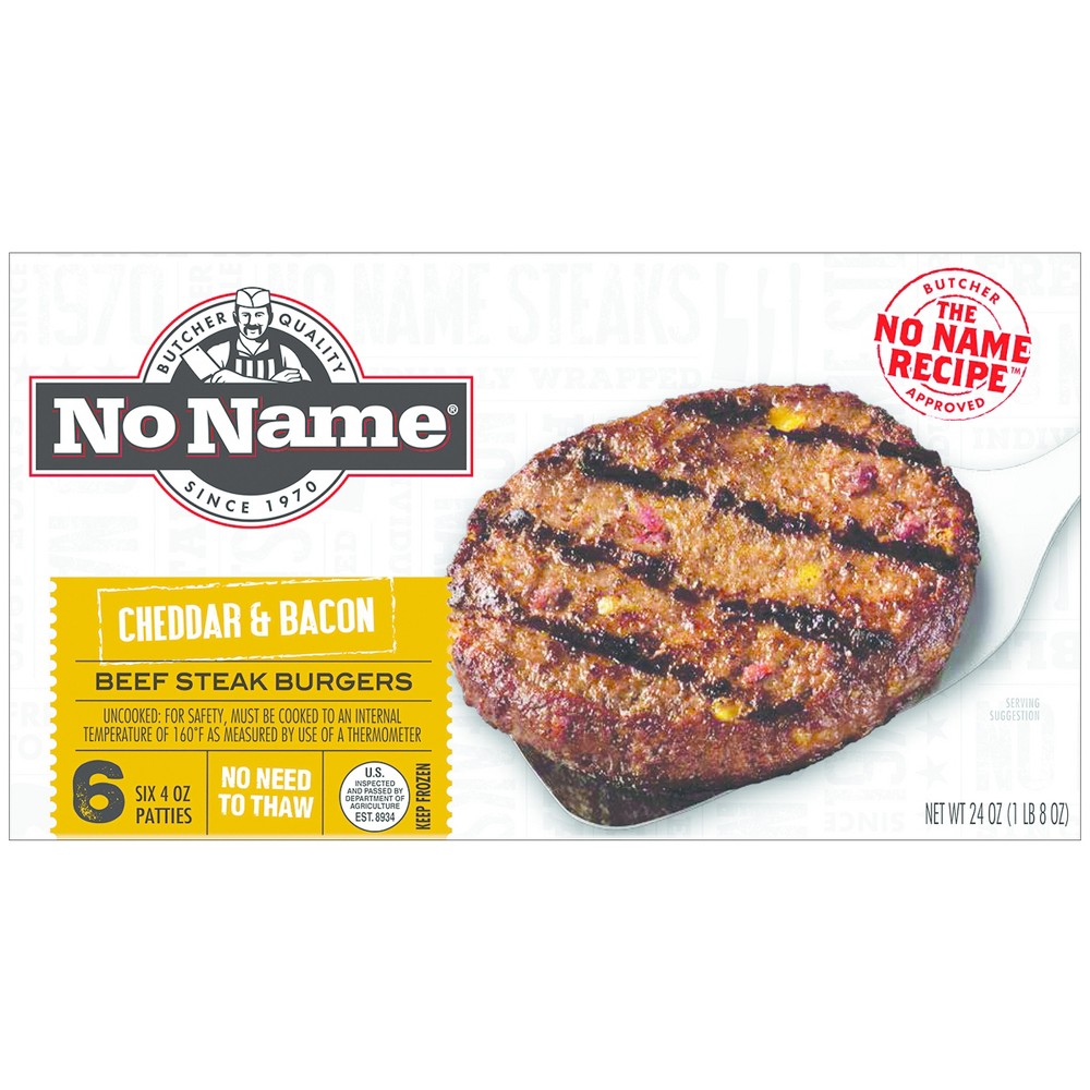 - The manufacturer of Cheddar & Bacon Beef Steak Burgers, Cheddar & Bacon is No Name.