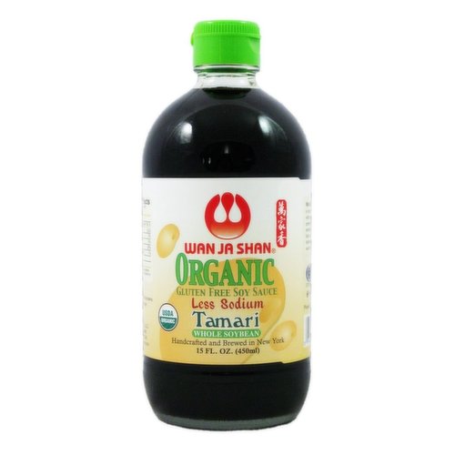 Wan Ja Shan Tamari Sauce in 15fl oz bottle. Gluten free, cholesterol free, fat free Organic, Tamari is naturally brewed from organic whole soybean without any added artifical colors, flavors, or preservatives. The traditional brewing process is extended up to one year, creating an even richer flavor, taste, and aroma. Tamari Sauce is ideal for barbecuing and also makes an excellent dipping sauce for seafood. Product of USA.