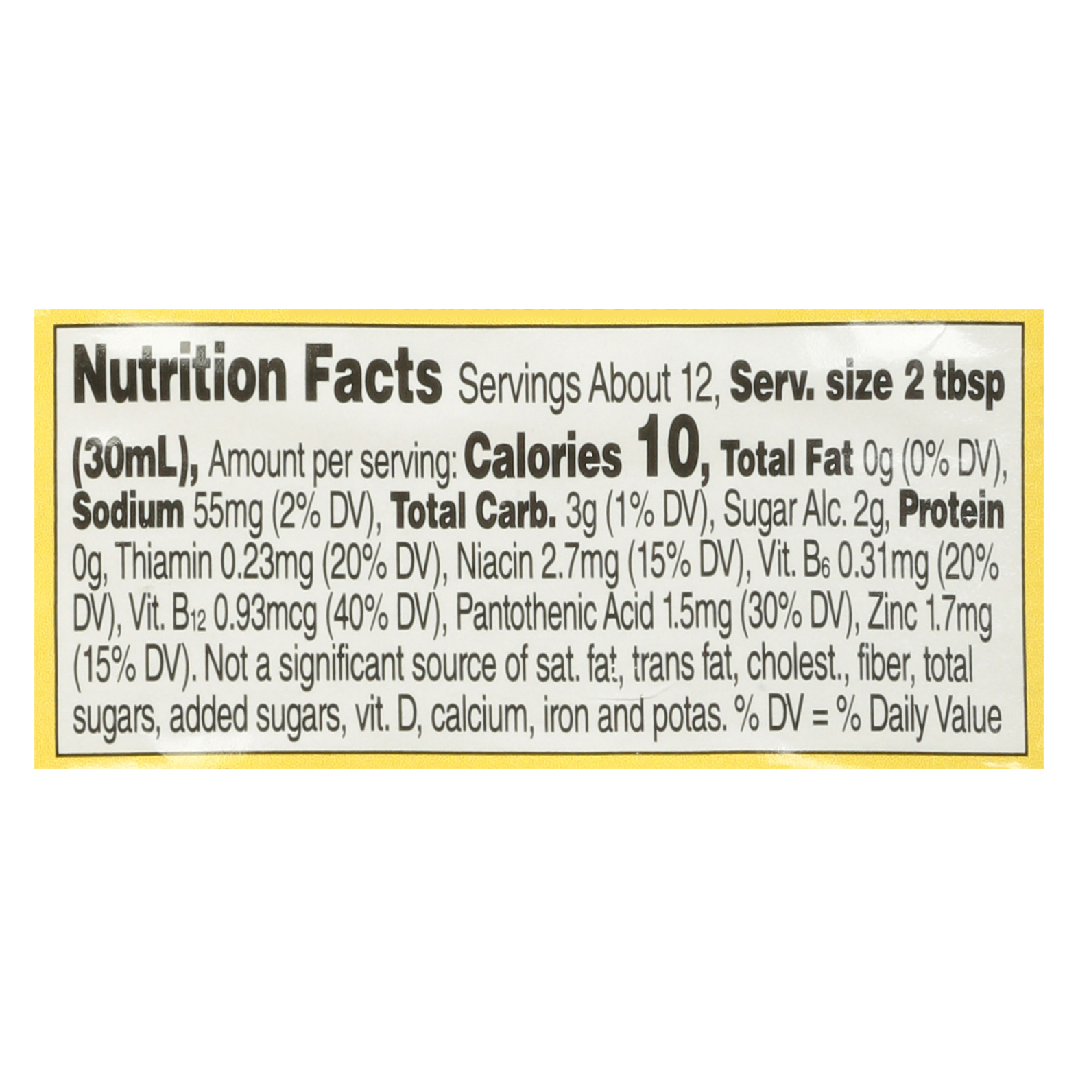 Water, Sorbitol, Natural and Artificial Flavors, Cellulose Gum, Salt, Potassium Sorbate and Sodium Benzoate (to Preserve Freshness), Sucralose, Caramel Color, Phosphoric Acid, Aspartame, Acesulfame Potassium, Zinc Lactate, Niacinamide (Vitamin B3), D-Calcium Pantothenate (Vitamin B5), Cyanocobalamin (Vitamin B12), Pyridoxine Hydrochloride (Vitamin B6), Thiamine Mononitrate (Vitamin B1), Citric Acid.