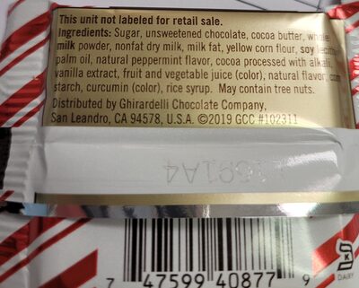 Sugar, Unsweetened Chocolate, Cocoa Butter, Whole Milk Powder, Nonfat Dry Milk, Milk Fat, Yellow Corn Flour, Soy Lecithin, Palm Oil, Natural Peppermint Flavor, Cocoa Processed with Alkali, Vanilla Extract, Fruit and Vegetable Juice (Color), Natural Flavor, Corn Starch, Curcumin (Color), Rice Syrup, May Contain Tree Nuts,