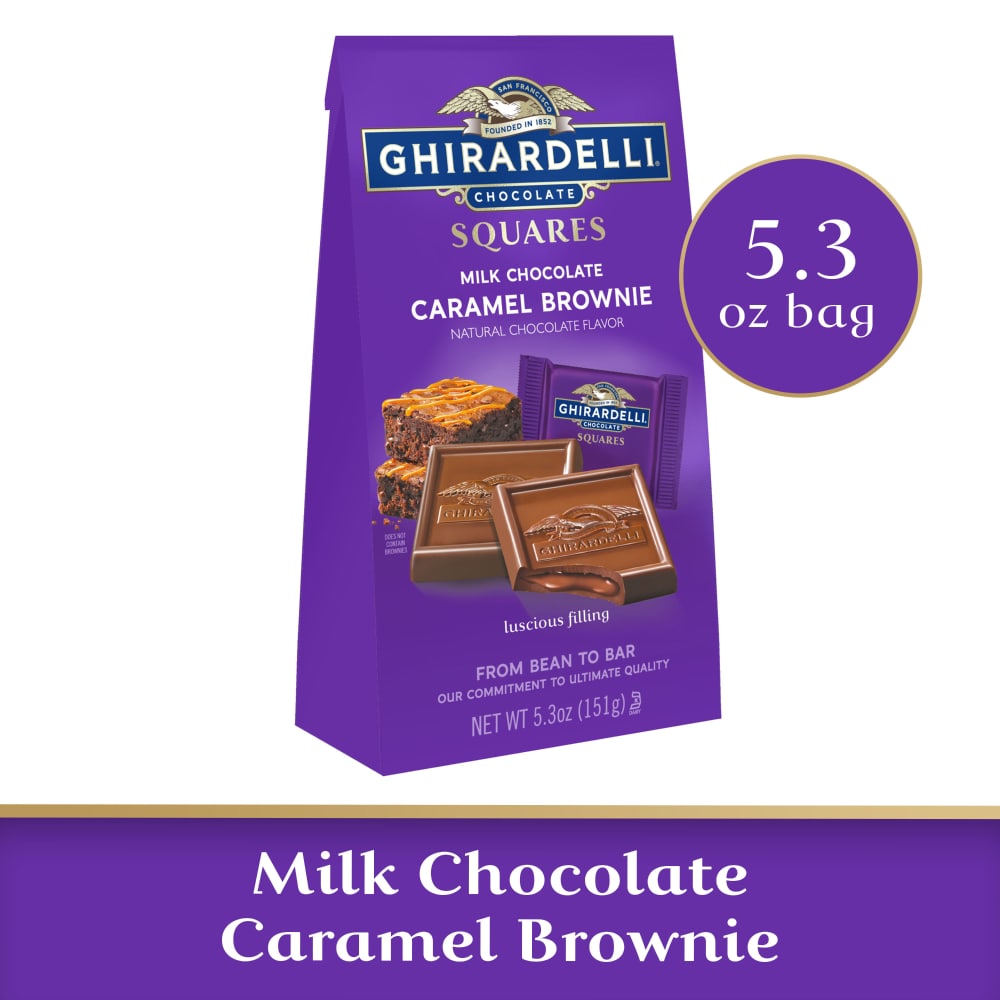 Filled with luscious caramel brownie centers, Ghirardelli(r) milk chocolate caramel Squares(tm) deliver premium chocolate and caramel with a fudgy brownie flavor. Individually wrapped in purple wrappers within stand-up bags that feature the terms "bean to bar" letting customers know Ghirardelli is committed to quality.