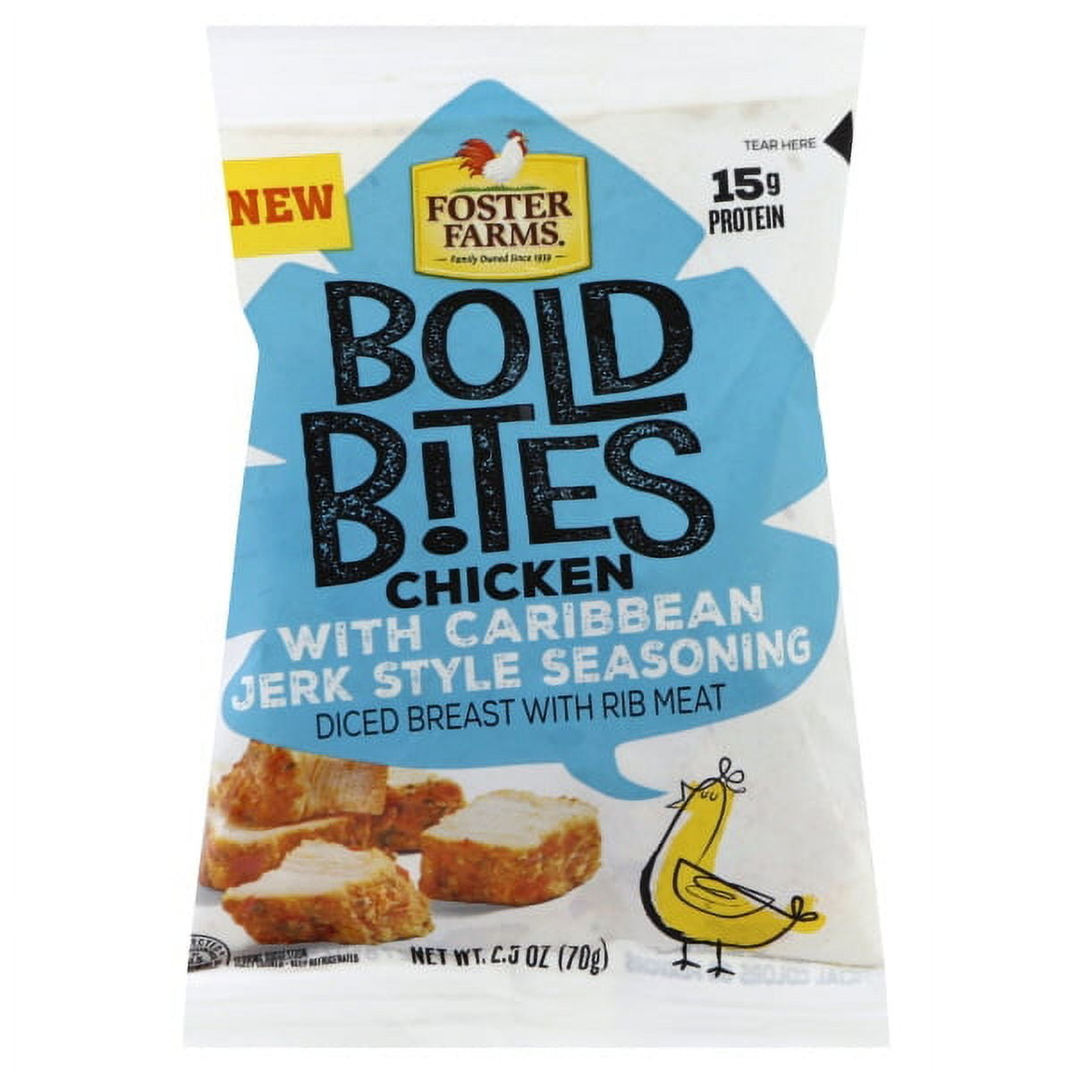 - The manufacturer of Caribbean Jerk Style Seasoned Diced Chicken Breast with Rib Meat Bold Bites, Caribbean Jerk Style is Foster Farms.