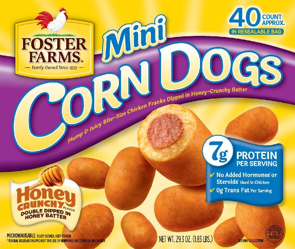 Foster Farms Mini Chicken Corn Dogs feature a plump & juicy bite-size chicken frank double dipped in honey-crunchy batter. Easy to heat & eat. They're fun-tastic anytime! Double dipped in honey-crunchy batter7g of protein per servingNo added hormones or steroids used in chicken.