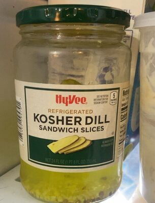 Kosher Dill Sandwich Slices is manufactured by Hy-vee, Inc. with a suggested serving size of 2 Pieces) | (about (28 G) and has 5 calories per serving.