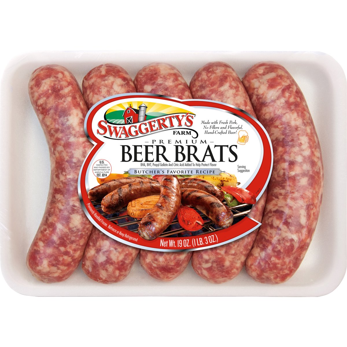 Swaggerty's Farm Premium Bratwurst are made fresh daily from their best cuts of pork using no artificial fillers, hand-crafted beer and seasoned with their butcher's favorite recipe of spices. 5 count package.