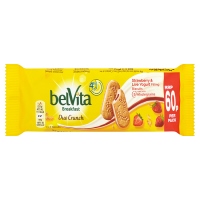 Gently baked breakfast biscuits made with wholegrain cereals with a fruity strawberry centre surrounded by a creamy live yogurt filling. Proven to slowly release carbohydrates for 4 hours. Made with a blend of 5 wholegrains and a source of vitamins and minerals. Suitable for vegetarians. Energy for the whole morning!** 5 Wholegrains, Gently Baked Rich in Cereals, Source of Fibre, Source of Vitamin E and B1, Magnesium, Calcium and Iron, Made with wholegrain **belVita breakfast biscuits have a high content of slowly digestible starch, which is a slow release carbohydrate. Consumption of foods high in slowly digestible starch raises blood glucose concentration less after a meal compared to foods low in slowly digestible starch. 4h slow release of carbohydrates* *belVita biscuits in a balanced breakfast regularly release carbohydrates over 4 hours. And this is proven in several scientific studies with belVita breakfast biscuits. 2 belVita breakfast biscuits (for slow release carbohydrates) + a plain dairy product (for your calcium intake) + a fruit (for vitamins) + a tea or a coffee (for your hydration) It will provide you 20%-25% of your daily needs as per nutrition recommendations. Enjoy as part of a varied and balanced diet and healthy lifestyle. Visit /BelvitaUK.