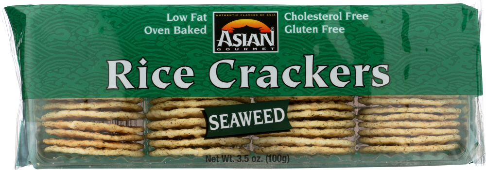 Asian Gourmet Rice Crackers Seaweed. Oven baked, low fat, cholesterol free and gluten free.