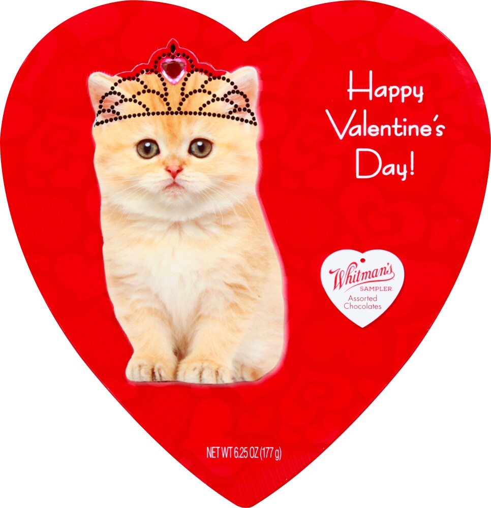 The perfect Valentine's Day gift; a 6.25 oz. 3 dimensional dressed pet heart-shaped box filled with classic Whitman's Sampler chocolates.