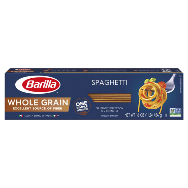 Discover how delicious whole grain can be. Barilla Whole Grain Spaghetti has the same great taste you'd expect from Barilla and is made with 100% whole wheat and provides an excellent source of fiber in each serving.