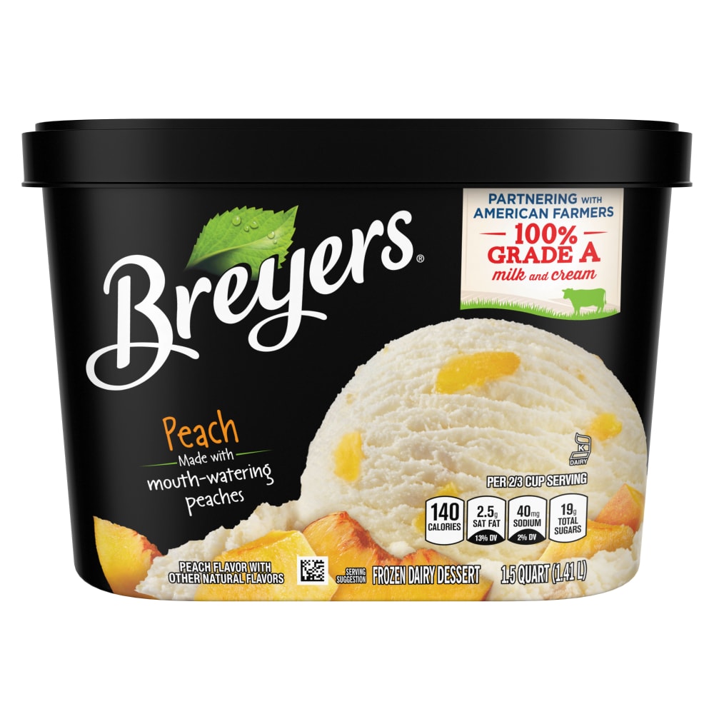 - The manufacturer of Peach Flavor Frozen Dairy Dessert, Peach is Breyers.