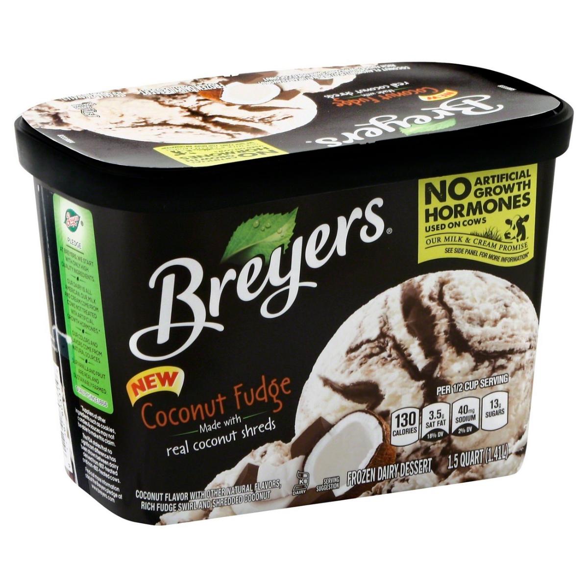 - The manufacturer of Coconut Fudge Coconut Flavor Rich Fudge Swirl and Shredded Coconut Frozen Dairy Dessert is Breyers.