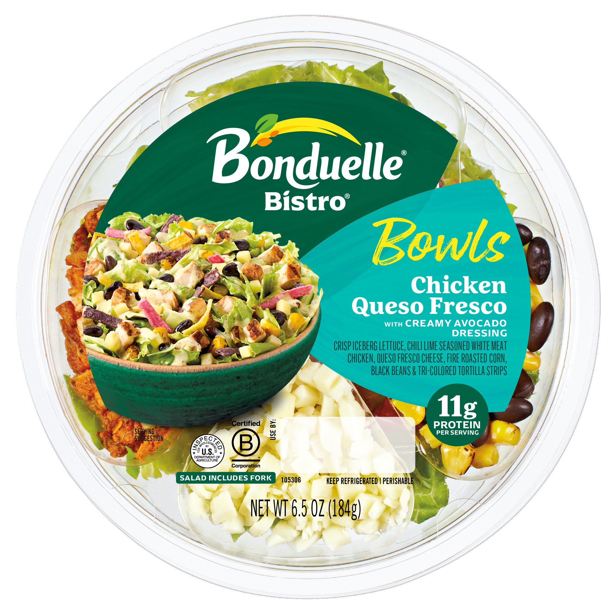 Romaine lettuce, grilled chili lime seasoned white meat chicken, queso fresco cheese, black beans, fire roasted corn and tri-colored tortilla strips with creamy avocado dressing. 330 calories. 12 g protein. Fresh air seal let's veggies breathe. Fork inside. Inspected for wholesomeness by US Department of Agriculture. www.readypac.com.