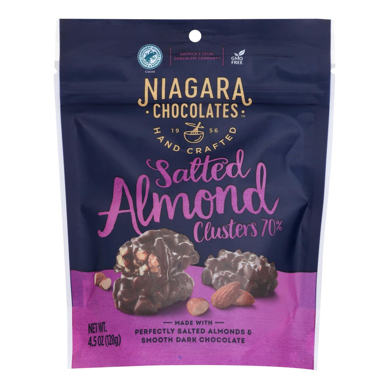 Indulge in the irresistible combination of dark chocolate, salted almonds, and crunchy clusters with Niagara Clusters. Made with premium ingredients, each bite delivers a satisfying blend of flavors and textures. Perfect for snacking or gifting, this pack of 6 4.5 oz bags will satisfy any chocolate lover's cravings.
