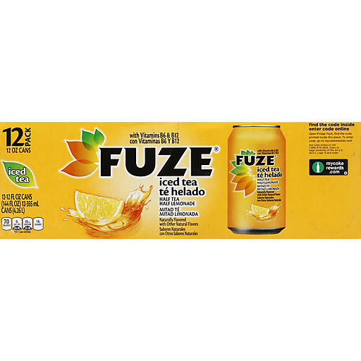 Fuze® Half Tea Half Lemonade Iced Tea. 12 pack. 12 fl oz cans. Vitamins B6 & B12. Natural lemon flavor with other natural flavors. Per 1 can serving. 70 calories. 0g sat fat, 0% DV. 115mg sodium, 5% DV. 18g sugars. 12-12 fl oz cans (144 fl oz). 12-355ml cans (4.26L).