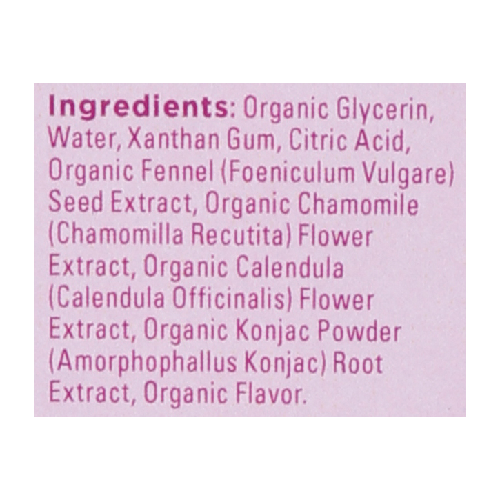 Organic Glycerin, Purified Water, Organic Ginger (Zingiber Officinale) Root Extract, Organic Chamomile (Chamomilla Recutita) Flower Extract, Organic Vanilla (Vanilla Planifolia) Bean Powder, Xanthan Gum, Organic Cherry Flavor, Citric Acid, Organic Konjac (Amorphophallus Konjac) Root Powder, Organic Fennel (Foeniculum Vulgare) Seed Extract, Organic Calendula (Calendula Officinalis) Extract, Organic Thyme (Thymus Vulgaris) Leaf Extract