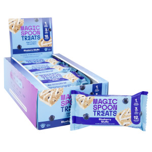 Magic Spoon Blueberry Muffin Treats are packed with 12g protein, real blueberries, and covered in white chocolatey frosting. Tastes like fresh out of the oven and with 1gram of sugar per serving it is a better-for-you treat. Packaging reflects the brand's whimsical take on childhood favorites attracting attention. Individually wrapped bars come in a countertop display making merchandising simple.
