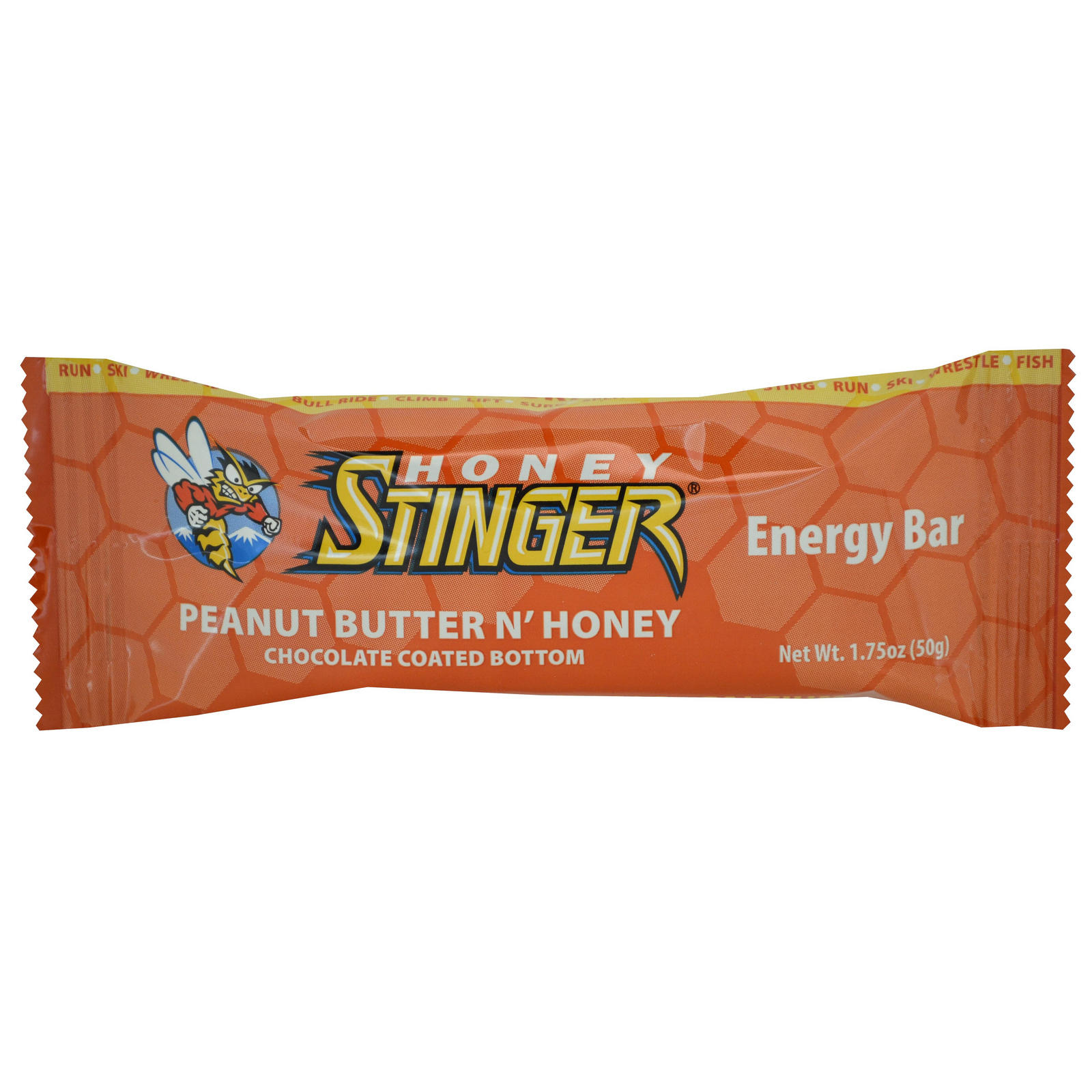 Chocolate coated bottom. Run. Ski. Wrestle. Fish. Bull ride. Climb. Lift. Surf. Split wood. Ride. Sting. Pure natural energy. honeystinger.com. 23 vitamins & minerals. Calcium. 5 g protein. Over 30% honey. Made in the USA.
