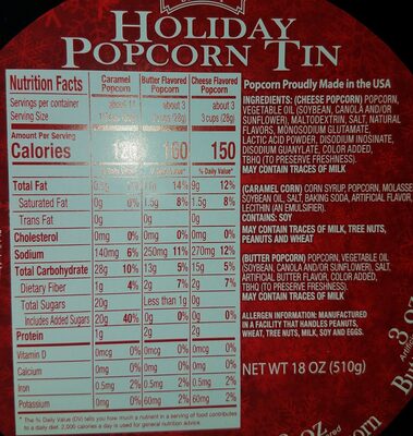 (Cheese Popcorn) Popcorn, Vegetable Oil (Soybean, Canolă And/Or 3 Cups (289) Sunflower), Maltodextrin, Salt, Natural Flavors, Mônosodium Glutamatē, Lactic Acid Powder, Disodium Inosinate, 150 Disodium Guanylaté, Color Added, Tbhq (to Preserve Freshness). Servings Per Container Serving Size Ahut 11 About 3 About 3 1/20P Gg Souns (28G) Amount Per Serving Calories 120 10 % Daily Value* May Contain Traces of Milk 0 14% 9G 0.34 0% 1.59G Total Fat 0G 0G 0% Omg 8% 1.5G 0G 0% Omg 12% (Caramel Corn) Corn Syrup, Popcorn, Molasse 8% Šoybean Oil, Salt, Baking Soda, Artificiál Flavor, Lecithin (an Emulsifier). Contains: Soy Saturated Fat Trans Fat 0G May Contain Traces of Milk, Tree Nuts, 0% Peanuts and Wheat Omg 140Mg 6% 250Mg 11% 270Mg 12% Cholesterol Sodium (Butter Popcorn) Popcorn, Vegetable Oil 5% (Soybean, Canola And/Or Sunflower), Salt, 5% 15G 7% 2G Total Carbohydrate 28G 10% 13G Dietary Fiber Total Sugars Includes Added Sugars 20G 40% 0G 1G 4% 2G Årtificial Butter Flavor, Color Addéd, 7% Tbhq (to Preserve Freshness). 20G Less Than 1G 0G May Contain Traces of Milk 0% Og 2G 0% Omcg 0% Omg 0% Allergen Information: Manufactured in a Facility That Handles Peanuts, Wheat, Tree Nuts, Milk, Soy and Eggs. 0% 2G 1G 0% Omcg 0% Omg Protein Vitamin D Omcg 0% Net Wt 18 Oz (510G) Omg 0.5Mg 2% 0.5Mg 2% 0.5Mg 2% 0% 60Mg Calcium Iron Omg 2% 60Mg 2% Potassium the % Daily Value (Dv) Tells You How Much a Nutrient in a Serving of Food Contributes to a Daily Diet. 2,000 Calories a Day Is Used for General Nutrition Advice. Pred Orn Artificio Bu